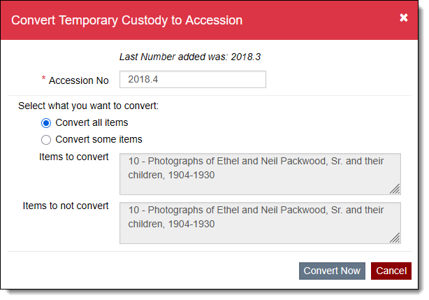 •Items not converted to the Accession will remain on the original Temporary Custody record with the original Receipt No.