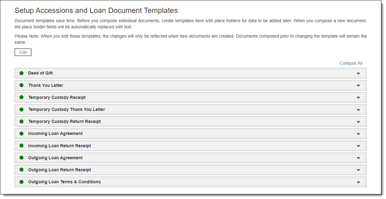 1.Click the "Edit" button at the top of the Setup Accessions and Loan Document Templates screen