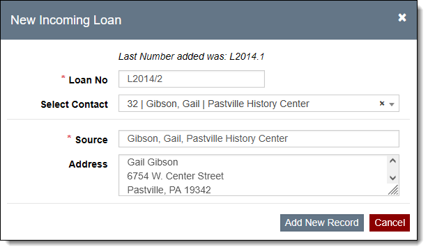 Each incoming loan must have a unique loan number to distinguish it from other loans. The loan number may include numbers and letters. We recommend that you use a basic two-part numbering system with the prefix "L" for creating your loan numbers, for example: L2014.1. This will give you the information about the year of the loan (2014), and it tells you that this is the first loan of the year 2014. However, PastPerfect is flexible and allows any loan numbering system you choose.