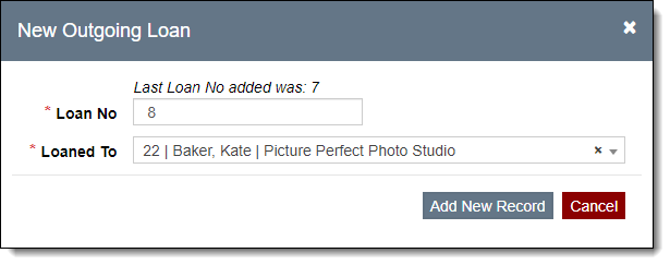 Each outgoing loan must have a unique loan number to identify the loan. The loan number is a numeric field, so it may only contain whole numbers. PastPerfect will display the last loan number added and will suggest the next number. We recommend that you allow PastPerfect to assign these numbers.