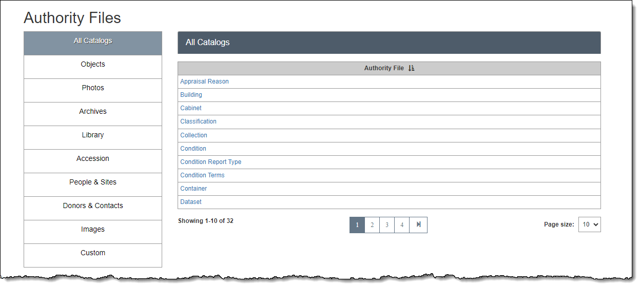 The Authority Files screen lists most of the available authority files. (Exceptions are the authority files for People & Creators and Sites, which are editable in their own areas of the program.) The Left Sidebar displays different tables where authority files are found and can help you locate a specific authority file.