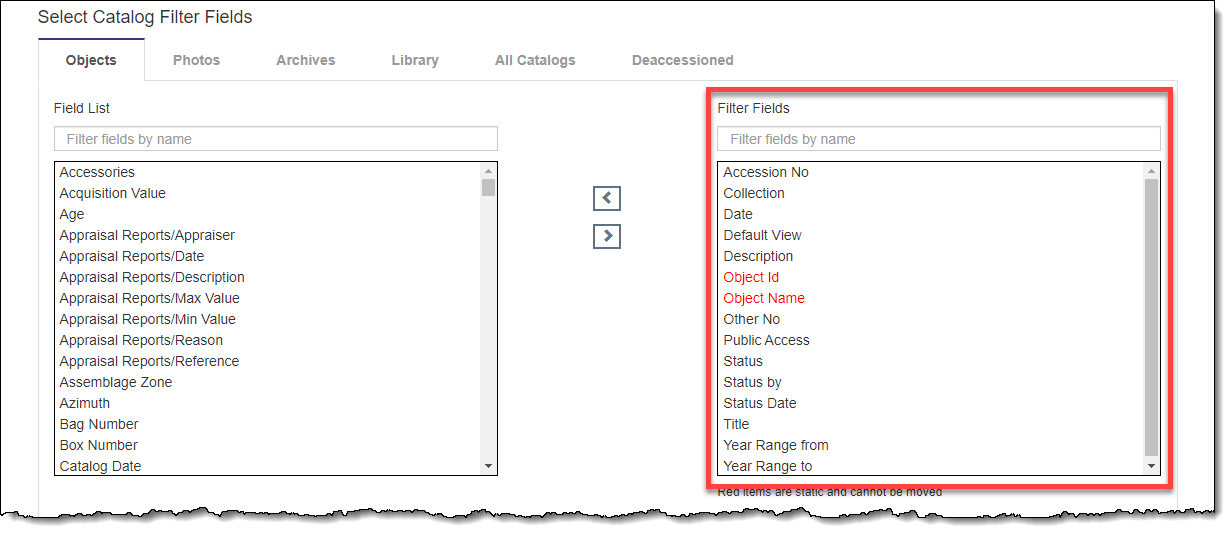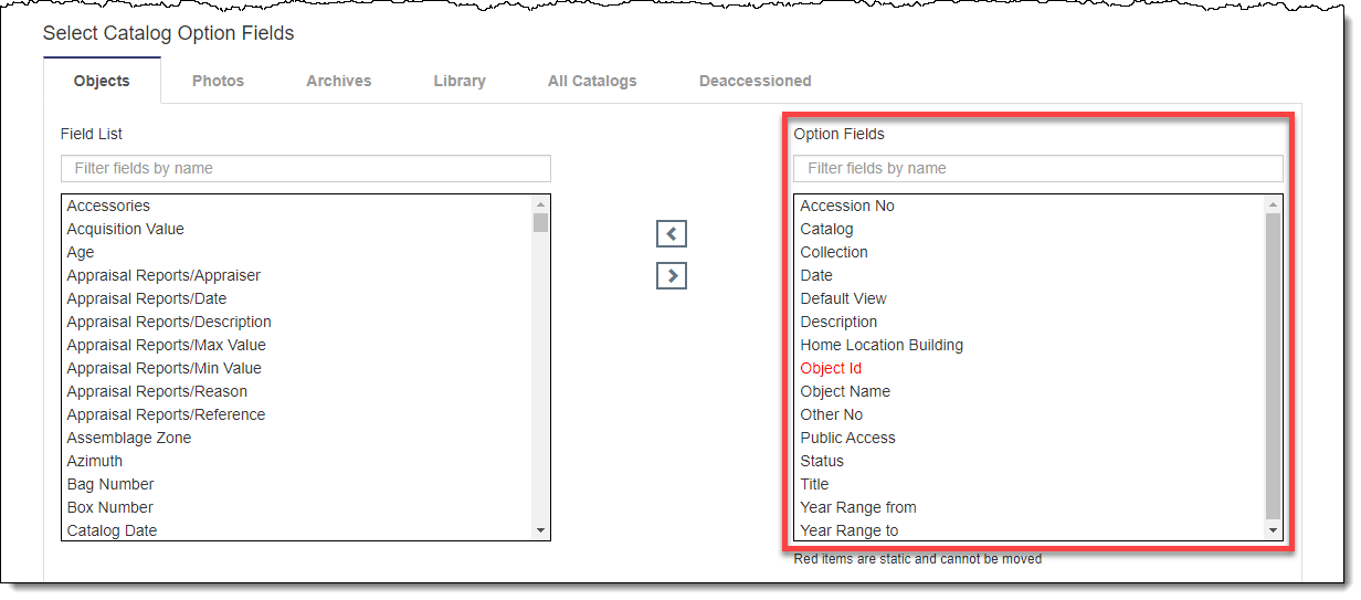 •To add a field, locate and select the field under the Field List column on the left. Then click the right arrow to move it to the Filter Fields or Option Fields column on the right. You should then see your new field listed on the right.