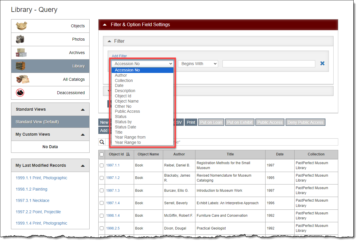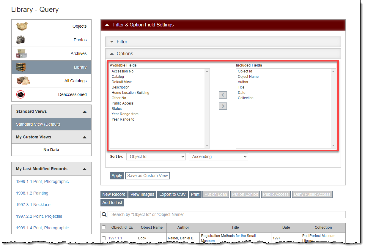 The Catalog Query screens include sections for Filter and Options. You can customize which fields are available for each of those sections. It is also possible to have different field selections for each catalog. By modifying these selections, you will be able to filter your records quickly and create custom views easily.