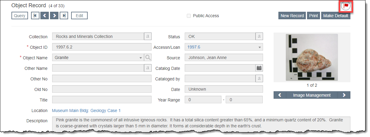 Catalog, Accession, and Contact records have the ability to be flagged for further attention later. The flag is located in the upper right corner of the record, above the Action buttons. When a record has been flagged, the Flag icon will appear in red.