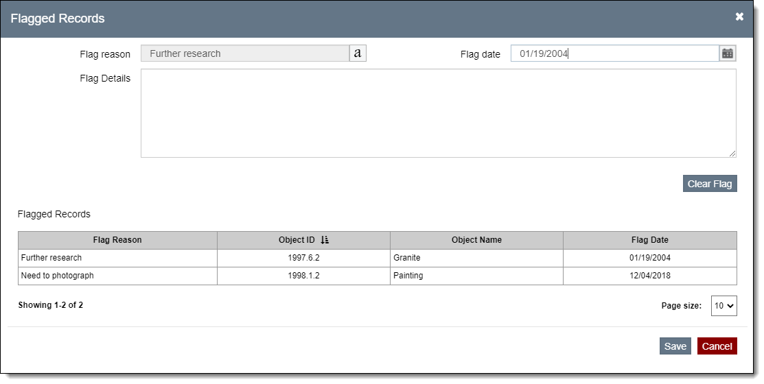 To view a flagged record, click the Flag icon to open the Flagged Records pop-up window. From here you can read the details about why the item is flagged as well as view a list of all of the flagged records. Click the Object ID, Accession No, or Last Name hyperlink to navigate to those records.