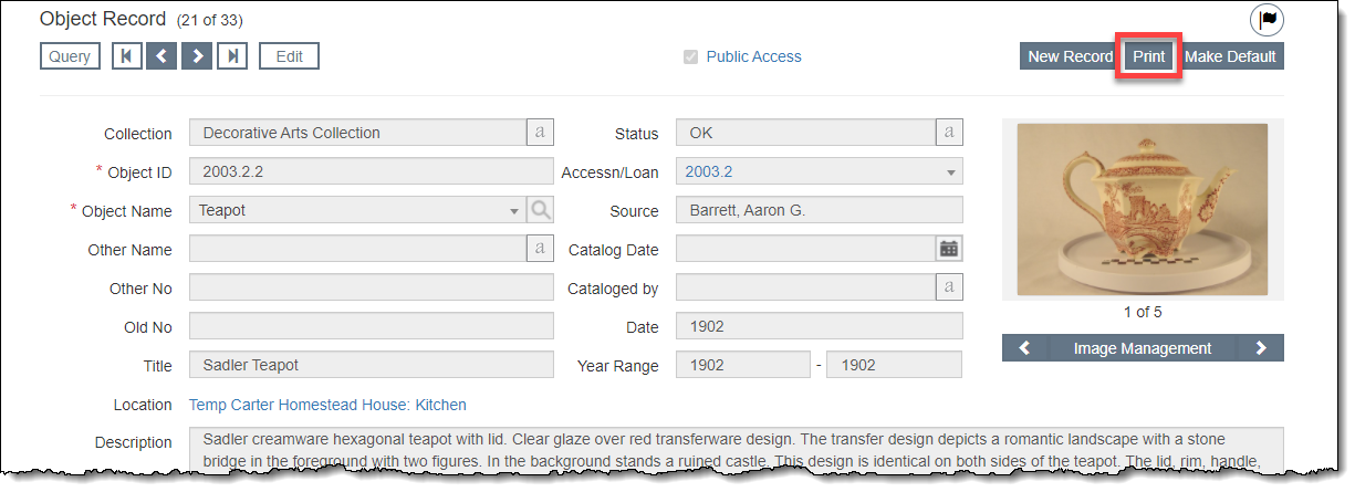 At the top of each record is a "Print" button, which allows you to print the record you are currently viewing. Additional print buttons may appear within the accordions to print records from related tables, like Condition Reports, Location History, and Appraisal Reports.
