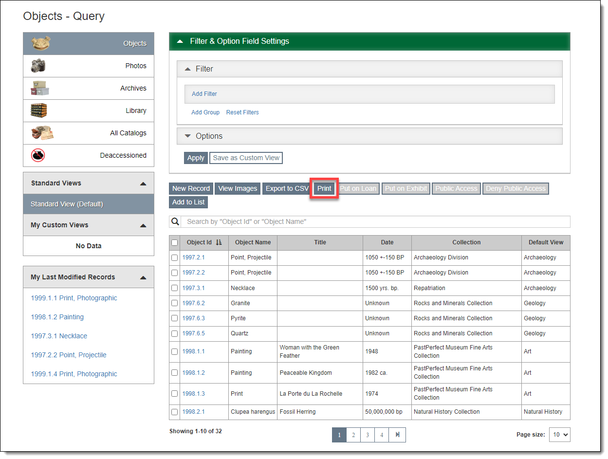 From a Query screen, you can print a report of the records that appear in the results of the Browse Grid. Use a filter to narrow the list if needed. For catalogs, you also have the option to include images on the report, as well as print labels.