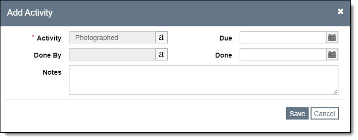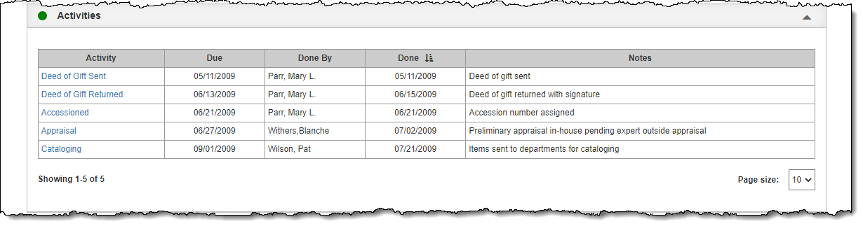 Collection Activities can be tracked in Temporary Custody, Accessions, Incoming Loans, and Outgoing Loans within the Activities Accordion. Common activities include sending the Deed of Gift and Thank You Letter, marking when the Deed of Gift was returned, and photographing the items. You can assign each task to a staff member, give it a due date, then track when the task was completed.