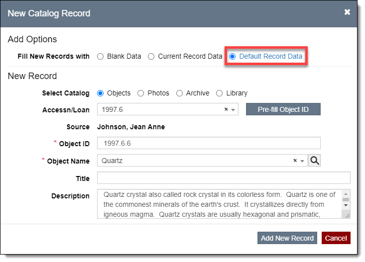 Default Records can save you time and keep data entry consistent by pre-filling fields when you add new catalog records. For example, if you are cataloging archaeological items in a single collection, you may want to create a default data record with the collection name in the Collection field, the excavator's name in the Excavated by field, and the archaeological site in the Site field. When new records are added, all three of those fields will be pre-filled with the default data.