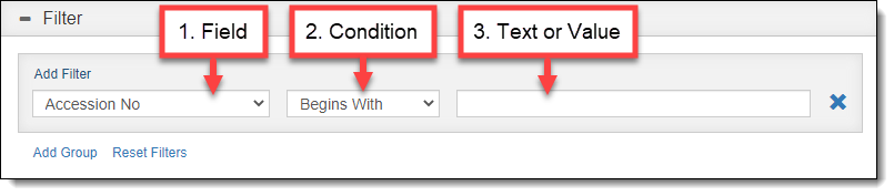 Part 3 (Text/Value) may not always be necessary depending on the condition you select. When it is required, how you populate it will depend on the field you select: sometimes you can select from an authority file; other times you can type in the text/value.