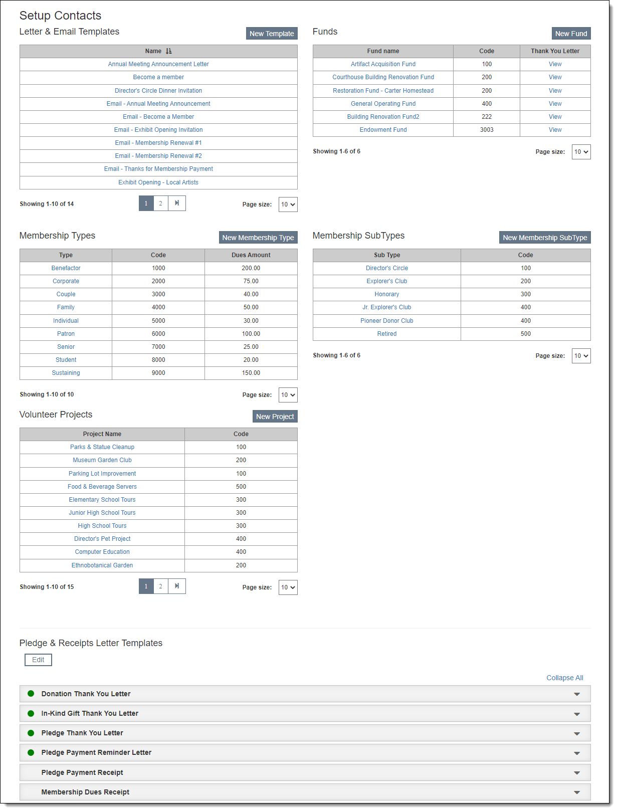 It is recommended that you set up your Contacts database parameters before beginning to enter data into Contacts. The Setup Contacts screen is where you will add your donation funds; define your membership types; set up mail merge letters and emails, including membership renewal letters; create default thank you letters for donations, in-kind gifts, pledges; compose your default membership dues receipt; and identify volunteer projects.