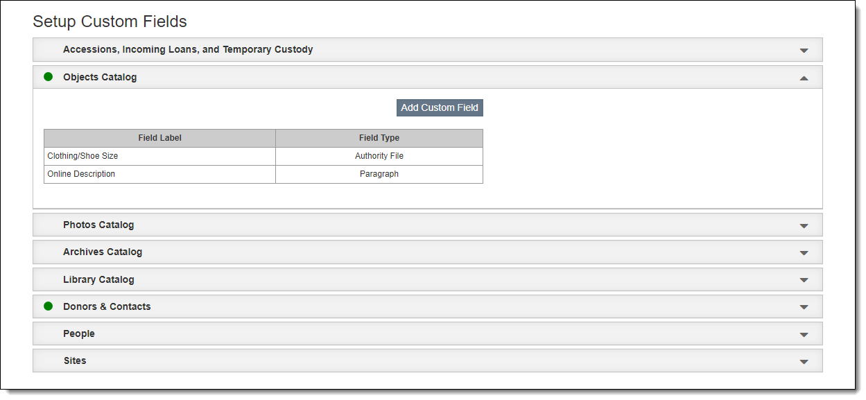 Even though PastPerfect comes with hundreds of data fields for describing your collection and tracking your contacts, there may be some information your institution wants to record that does not fit in existing fields. Custom fields give you the ability to add the fields you need.