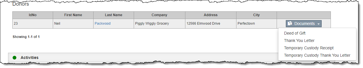 After your donors are selected, a Deed of Gift and a Thank You Letter may be printed for each contact. Templates for these documents may be set up first to speed the process, see Accessions and Loans Documents.