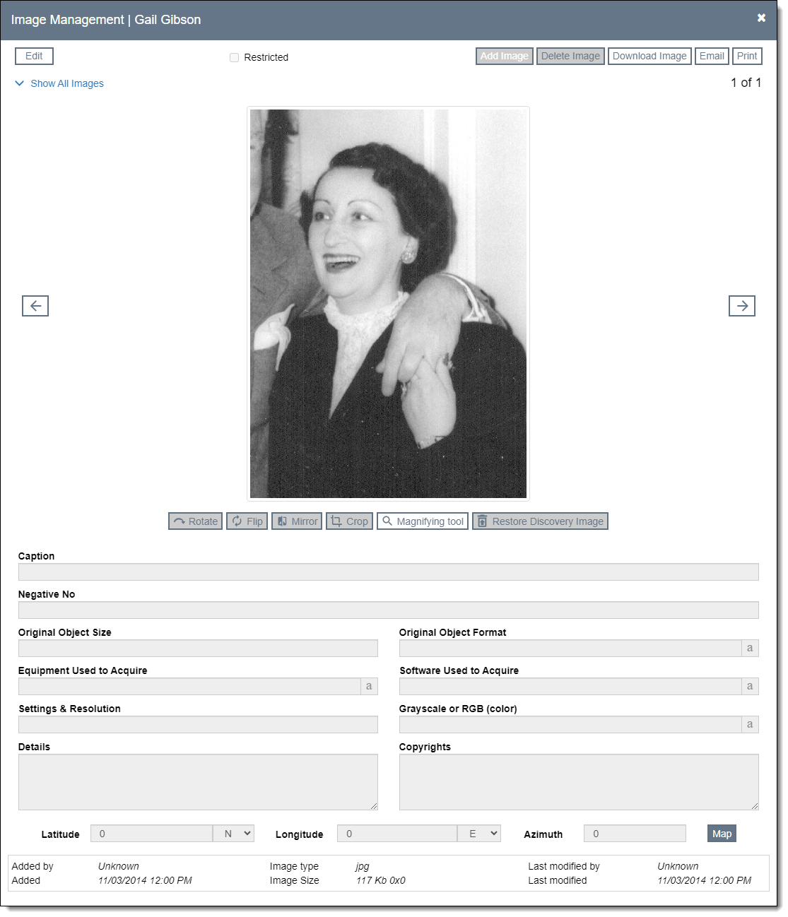 Images can be attached to catalog records, condition reports, exhibit records, people records, site records, and contact records.