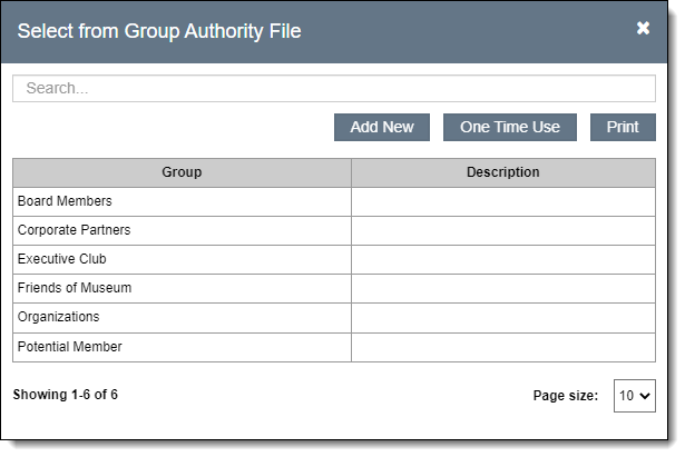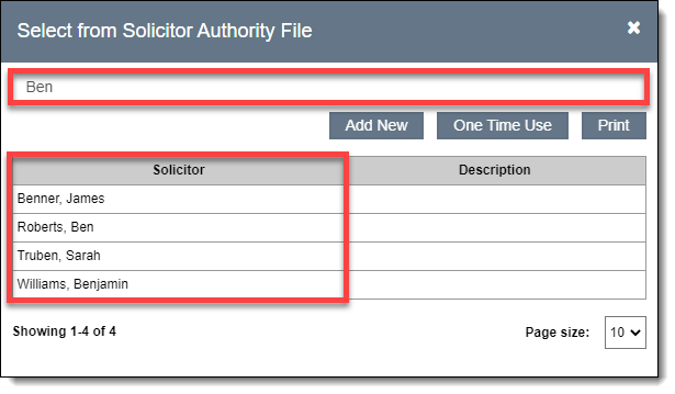 At the top of the authority file pop-up window, you can search for a specific entry. This is a contains text search. For example, searching for "Ben" brings up several entries that contain the letters "ben" somewhere in the entry: Benner, Ben, Truben, Benjamin, etc. Descriptions are not searched.