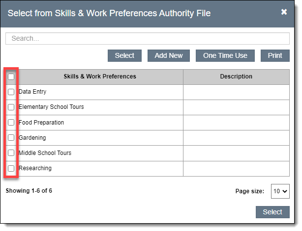 Other fields, like Skills & Work Preferences, allow for multiple entries. Check the box to the left of the entries you wish to use. When all desired entries have been selected, click the "Select" button to add these entries to the field and return to the record screen.