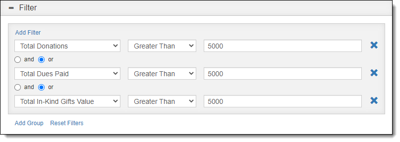 You want to view all of the contacts who have donated over $5000 or paid over $5000 in dues or given in-kind gifts valued over $5000.