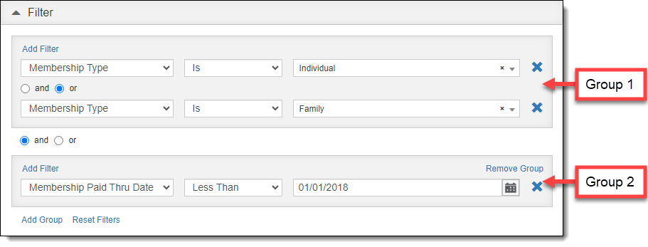 Since you are only looking for members who expired before 2018 who have either the Individual or Family membership types, you need to use both the OR and AND connectors.