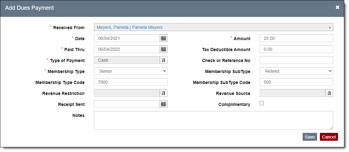 Note: Membership Name must be populated on a contact record in order to be able to add dues payments.