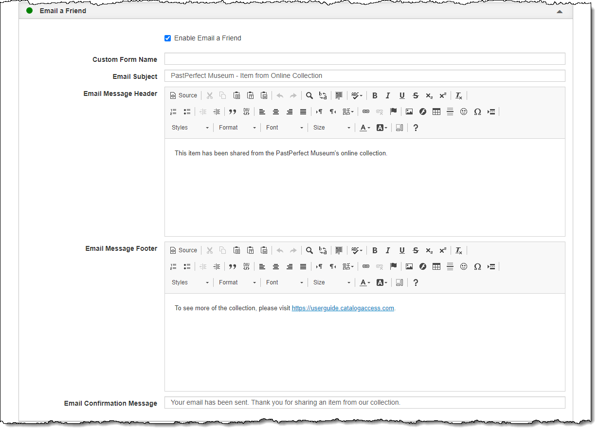 Enabling and customizing the Email a Friend Form can be done on the Email a Friend Accordion in Public Site Settings. You may either use the default messages or you can customize the messages for your organization.