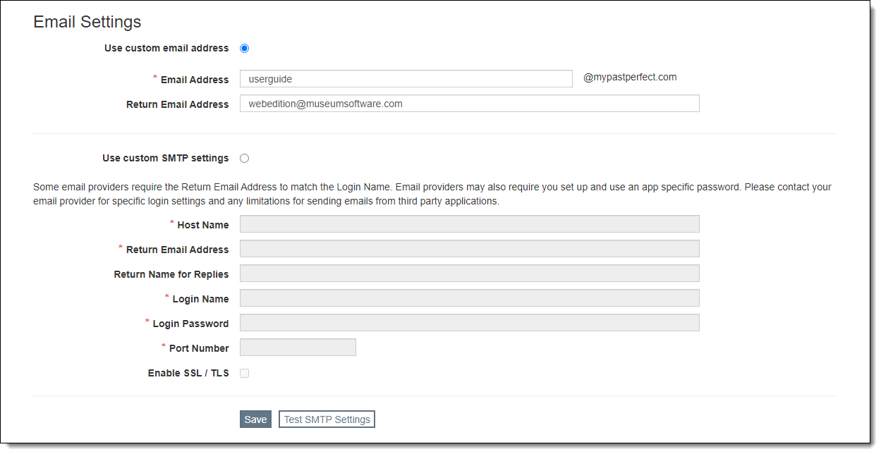 There are two options for sending email: Use custom email address or Use custom SMTP settings. By default, all users are set to Use custom email address. The custom Email Address will be pre-populated with the organization's PastPerfect Client Number so the sender will be ClientNumber@mypastperfect.com (e.g. 35294@mypastperfect.com) unless users change it. The ClientNumber can only be replaced with a value that is unique across all PastPerfect Web Edition organizations. With this setting, users are limited to sending 10 emails at a time.