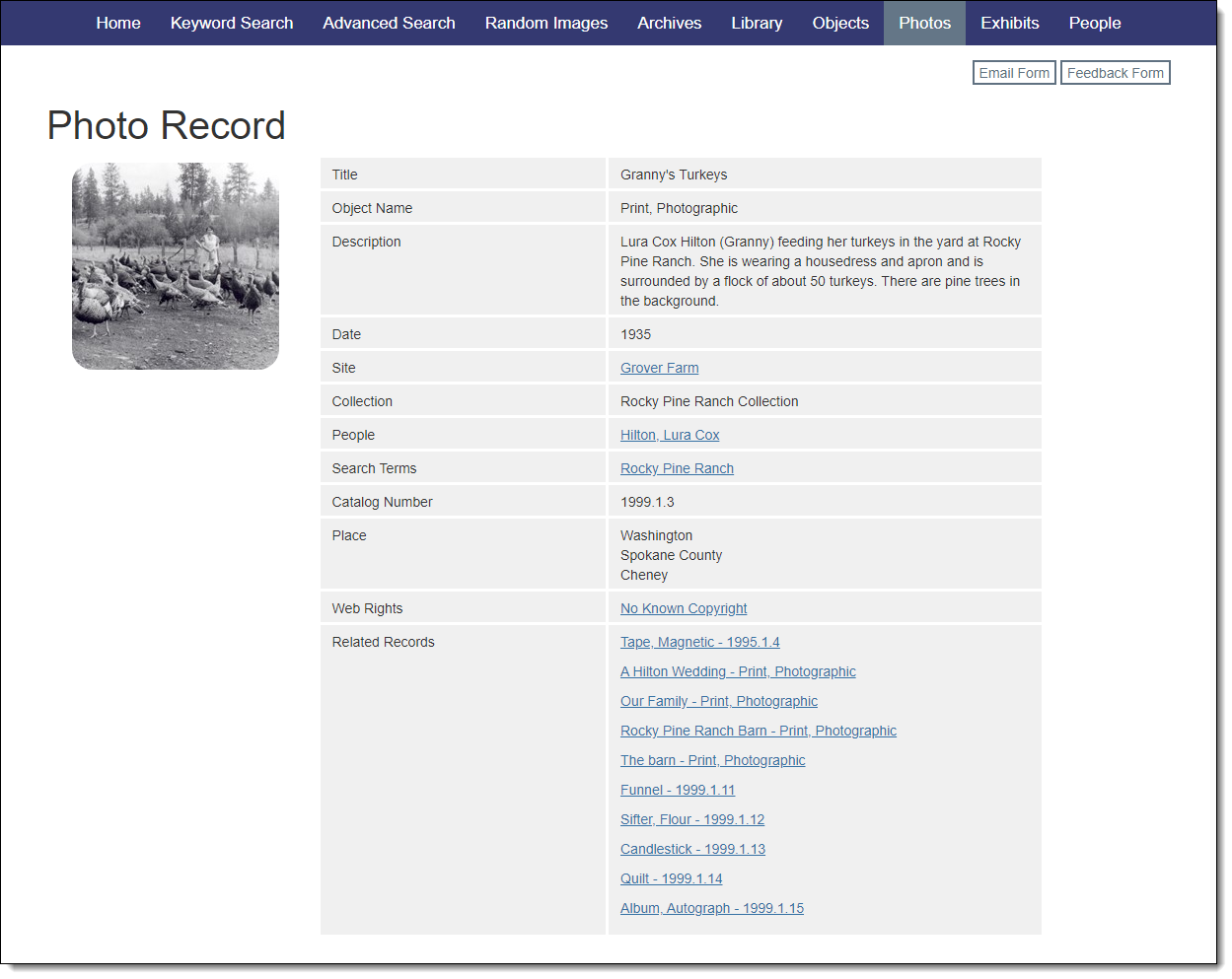 There are two main parts to the catalog records: The images section displays thumbnails from the catalog record. The data section is presented as a table to the right of the images with data fields pulled from your internal database. Additionally, at the top right, a series of buttons allows users to communicate with each other and the organization using email forms, if enabled. These email forms are customizable through Public Site Settings.