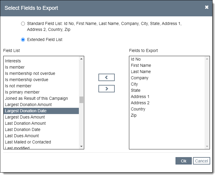 •To add a field to the export, select the field in the Field List column on the left, then click the right arrow. The field will move to the Fields to Export column on the right.