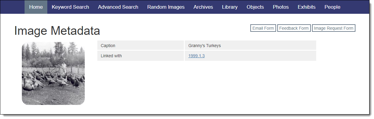 Image Metadata records will exist on your public site whenever there is an image associated with a record. Even if no Image fields are selected, the Image Metadata record page will display a "Linked with" field. This field contains the Object Id of the parent record and allows visitors to navigate to the parent record.