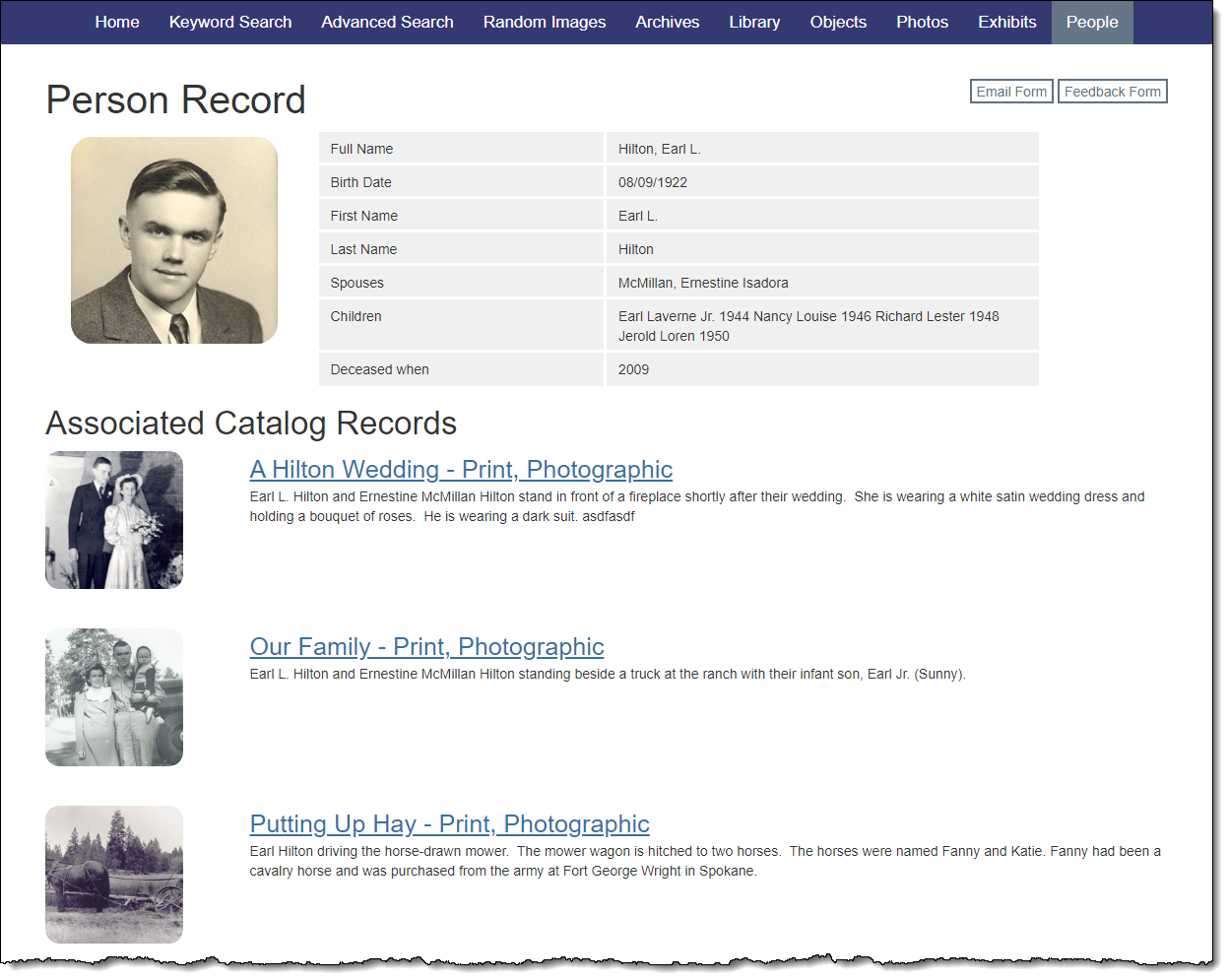 Sharing People records online can help your web visitors further explore your collection. Accessible from Keyword Search, Advanced Search, the People search button, or as links on catalog record pages, People records will display any fields from the People & Creator database you have selected to share online. There will also be a list of Associated Records for this person.