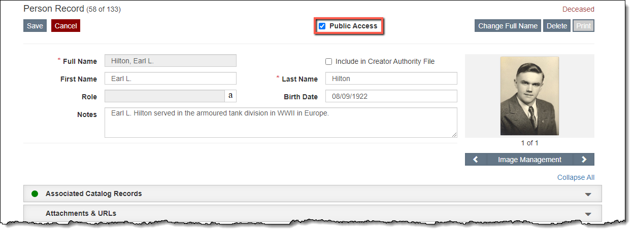 Including People records on your Public Access site is optional, and you may choose to exclude all or certain People records from displaying online. Similar to the catalog records, each Person record in PastPerfect has a Public Access check box that can be selected or deselected. By default, when you select a Person record to be included in Public Access, all images associated with that Person record are also selected to display on the public site. It is possible to deselect individual images on the Image Management screen.