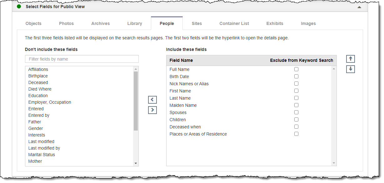 Be sure to select fields to include for your People records or else they will not display online. Including at least the Full Name field will allow your web visitors to easily view other records created by this same person. We suggest using either the Full Name field or the First Name and Last Name fields as your first fields to be included.