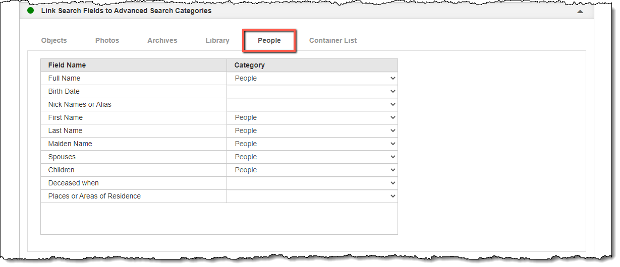 In order for People records to appear in the Advanced Search results, you have to link your People fields to the Advanced Search Categories. Not all fields need to be linked, but any field that you want to be searchable should be linked. If you do not link any People fields, the People records will still be accessible from the hyperlinks on the catalog records, but they will not come up in search results.