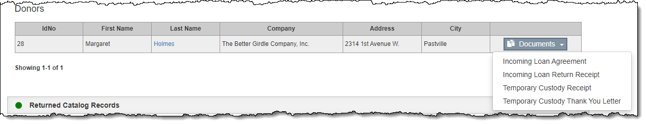 After your lenders are selected, an Incoming Loan Agreement may be printed for each contact listed in the Donors Grid. The template for this document may be set up first to speed up the process, see Accessions and Loans Documents.