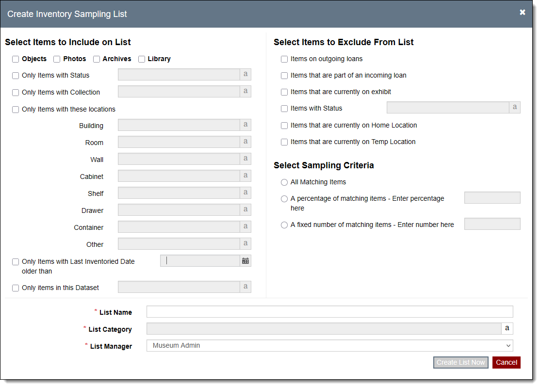 An Inventory Sampling List helps you compare your cataloged records to the physical items by defining which collection items should be checked. The program creates this list and populates it based on the records you have cataloged and user-selected criteria to specify which items to include or exclude on the list. In addition, you can choose whether the list has all items matching the criteria, a specific percentage, or a fixed number of items.