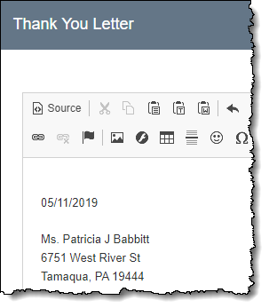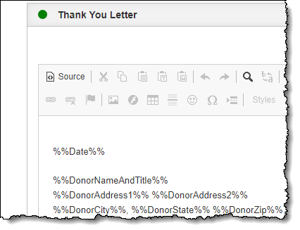 Please note: When you edit templates, changes will only be reflected when new documents are created. Record-specific documents composed before changing the template will remain the same. However, you can update those individual documents with the latest template using the "Rebuild" button on each specific letter/receipt.