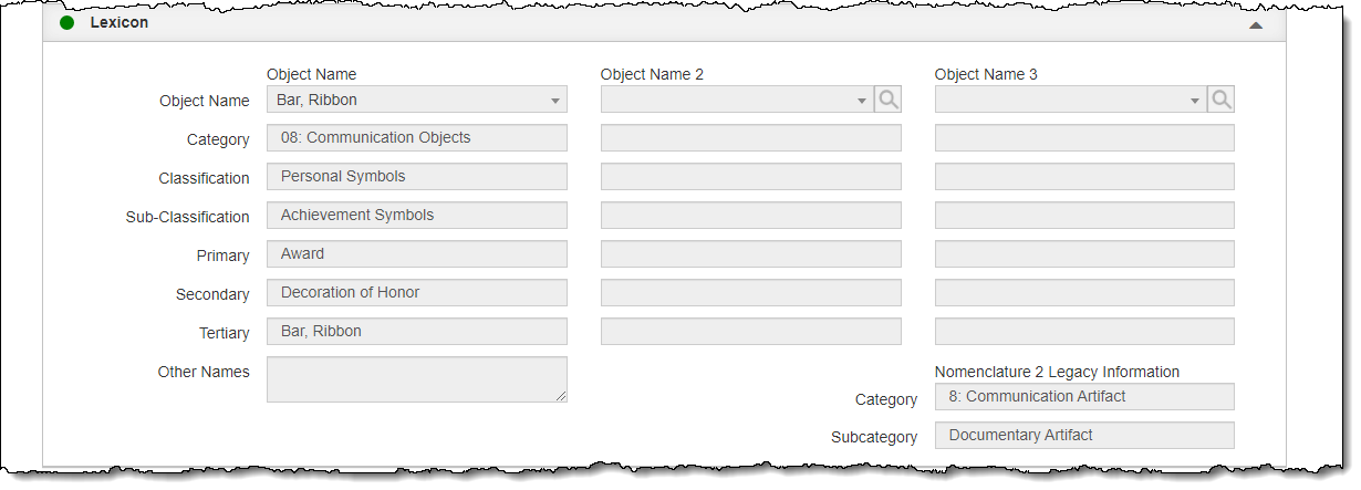 The Lexicon accordion also contains fields for Other Names and Nomenclature 2 Legacy Information. If an item has more than 3 Object Names, record the additional names in the Other Names field. For organizations who have upgraded from previous versions of PastPerfect and were using Nomenclature 2, the Category and Subcategory under Nomenclature 2 Legacy Information will be populated.
