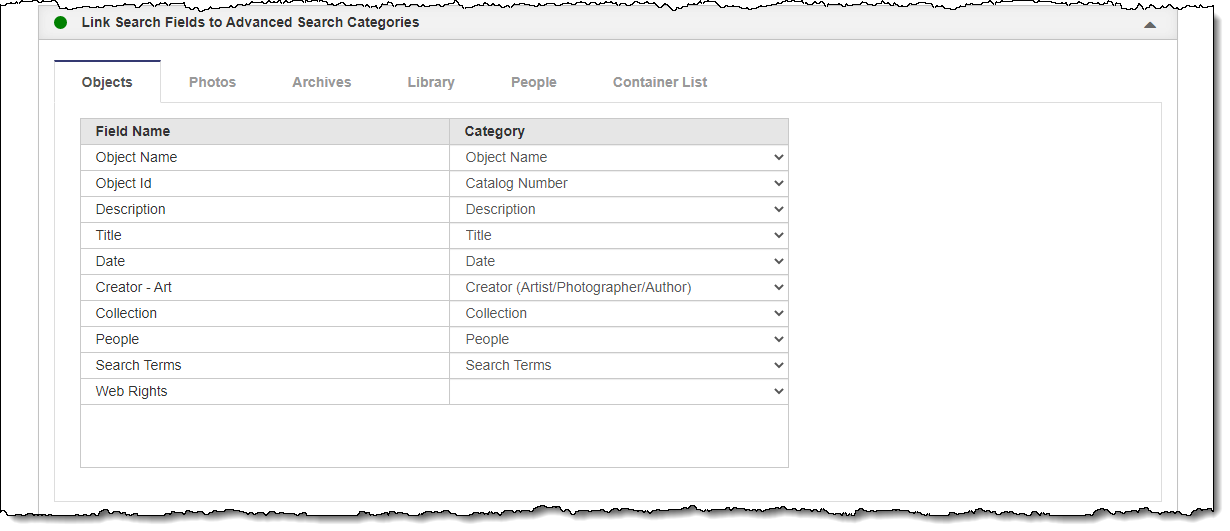 After you have created the Advanced Search Categories, you can then link each field you selected to display on your public site with one of those advanced search categories. When an online visitor performs an Advanced Search within a particular category, only the fields linked to that category will be searched. This accordion is where you can make those links. Each field can only be linked to one category. The fields on each tab are linked individually and you must save your changes on each tab before moving to another tab.