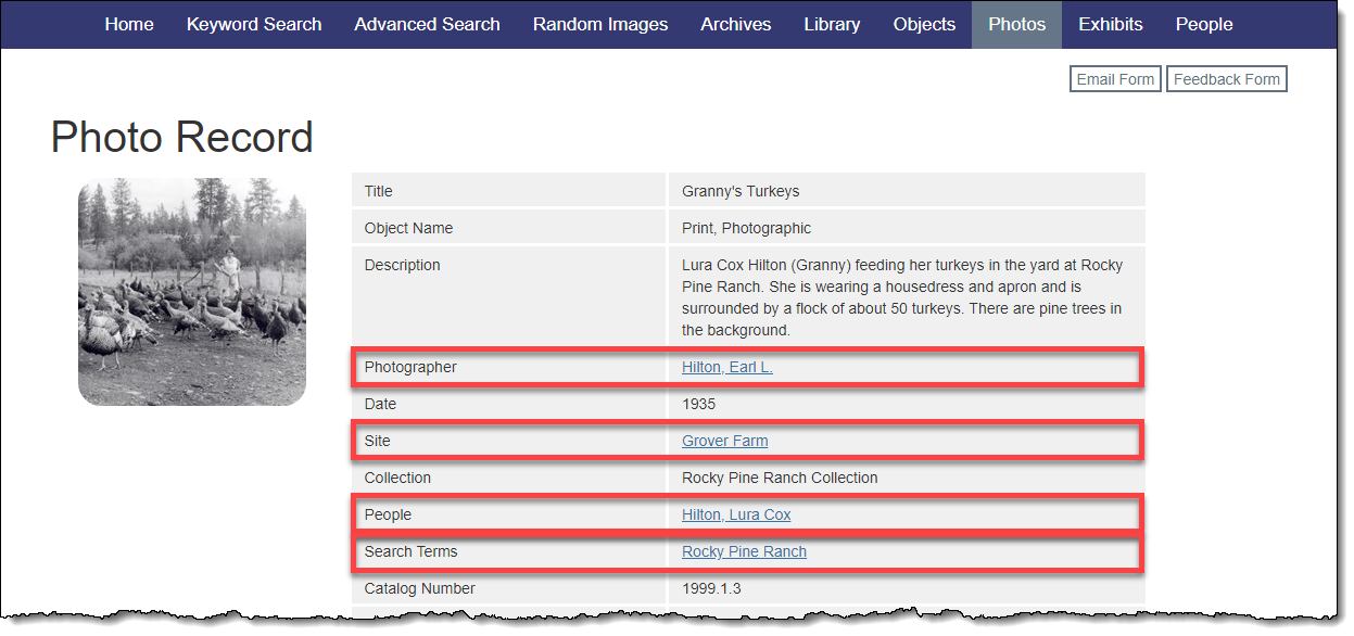 As with the catalog records, you can choose which of these additional records and which of their fields are shared online. We recommend including all of the additional records, even if you only share just one field (like Name). Having at least one field selected to display will create connections between catalog records sharing the same name or term. Your web visitors will be able to see those connections and can further delve into your online collections using those links.