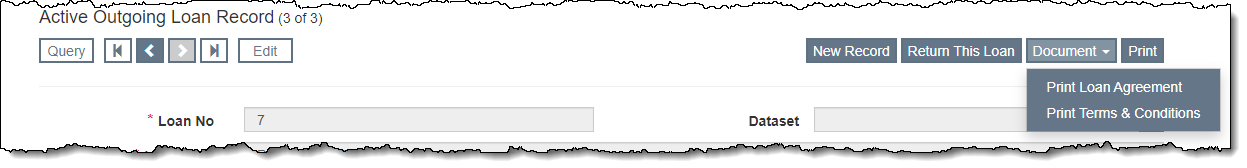 For Active Outgoing Loans, you can print a Loan Agreement and Terms & Conditions for each loan. For Returned Outgoing Loans, you can print a Return Receipt. Templates for these documents can be set up in Accessions and Loans Documents.