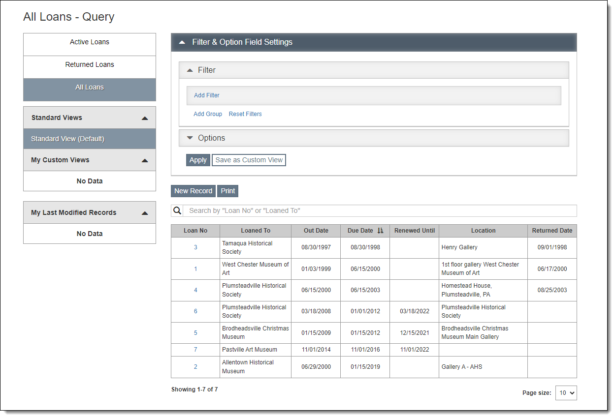 Active Loans track items that are currently out on loan. An active loan may have some returned items and others still out on loan. Returned Loan records keep track of the loans that have ended and all items have been returned to your institution. All new loans are considered Active until you return the loan; the Returned Date field does not affect the Active/Returned Status.