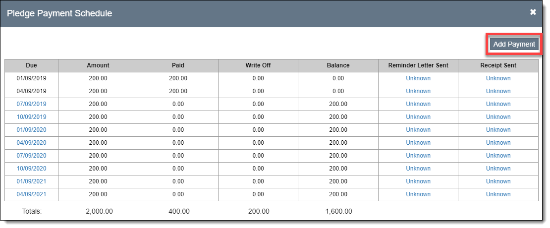 1.Click "Add Payment" on the Pledge Payment Schedule screen