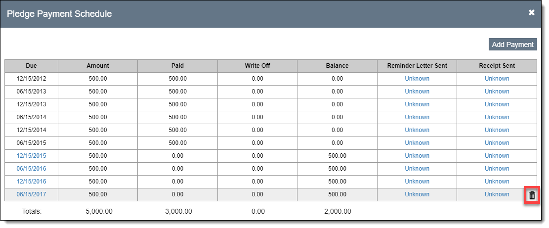 Deleting payments will cause the total amount pledged to decrease and will increase the write-off amount. On the Pledge Payment Schedule, it will move the amount due in the Amount column into the Write Off column.
