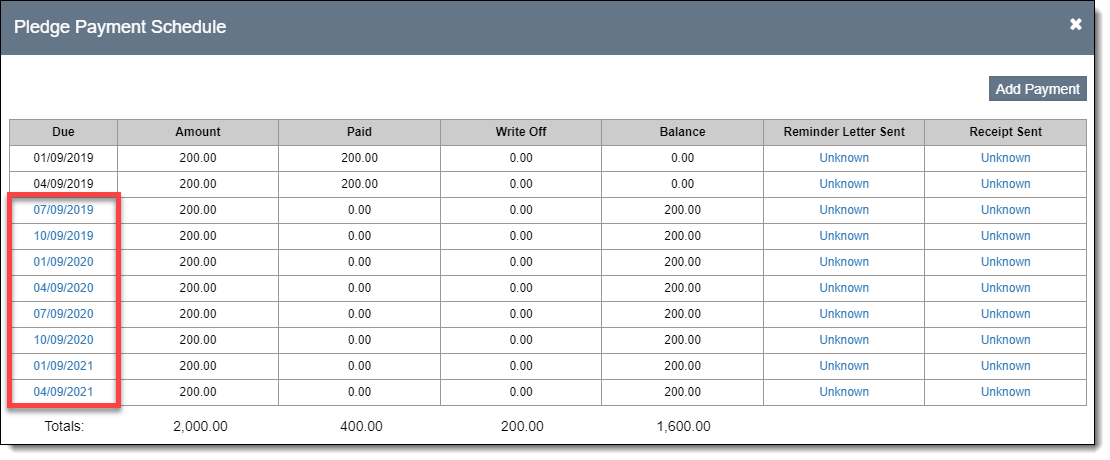 The Pledge Payment Schedule is a list of all the scheduled payments that make up the total pledge. For example, if John Smith pledged $1000 over 4 annual payments starting in 2016, he would have four scheduled pledge payments for his $1000 pledge: $250 in 2016, $250 in 2017, $250 in 2018, and $250 in 2019. Each of these four payments would be listed on the Pledge Payment Schedule, regardless of whether they had been paid.