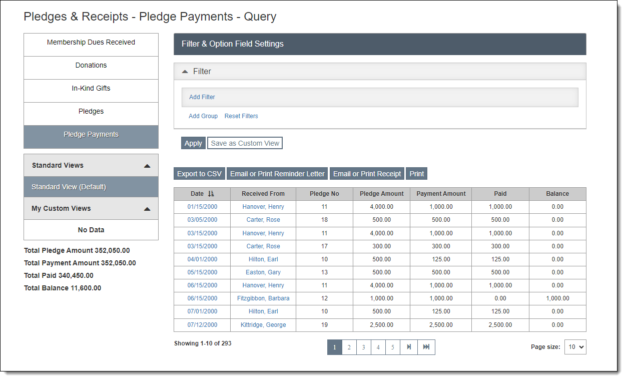 The Pledge Payments screen displays both future pledge payments that have not yet been made and pledge payments that have already been paid. You can use filters to narrow down the list. See Working with Filters for more details.