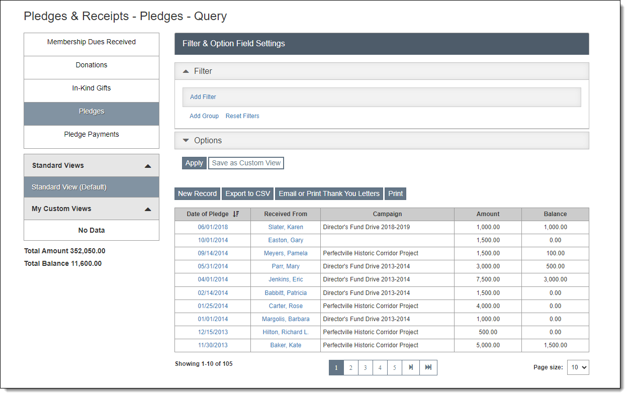 The Pledges section on the Pledges & Receipts Query screen displays all pledges, both completed and open pledges. If a contact has made more than one pledge, each pledge will be listed individually. You can use filters to narrow down the list. See Working with Filters for more details.