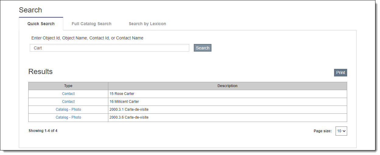 Quick Search allows you to perform a simple search for catalog and contact records using the Object ID, Object Name, Contact ID, or Contact Name fields.