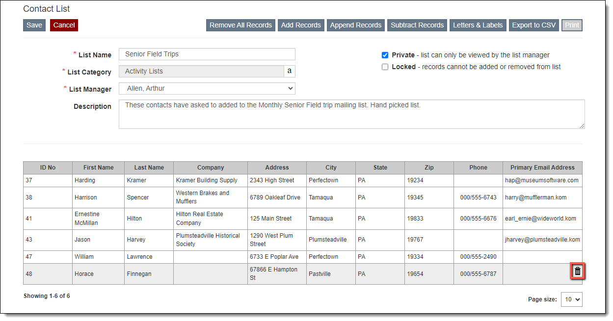 Contact records can be removed from contact lists in multiple ways: individually, subtracting one list from another list, or by clearing the whole list.