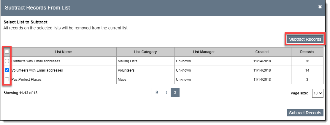 4.Select the list(s) that you want to subtract from your current list using the check boxes on the left. All records on the selected list(s) will be removed from the current list.
