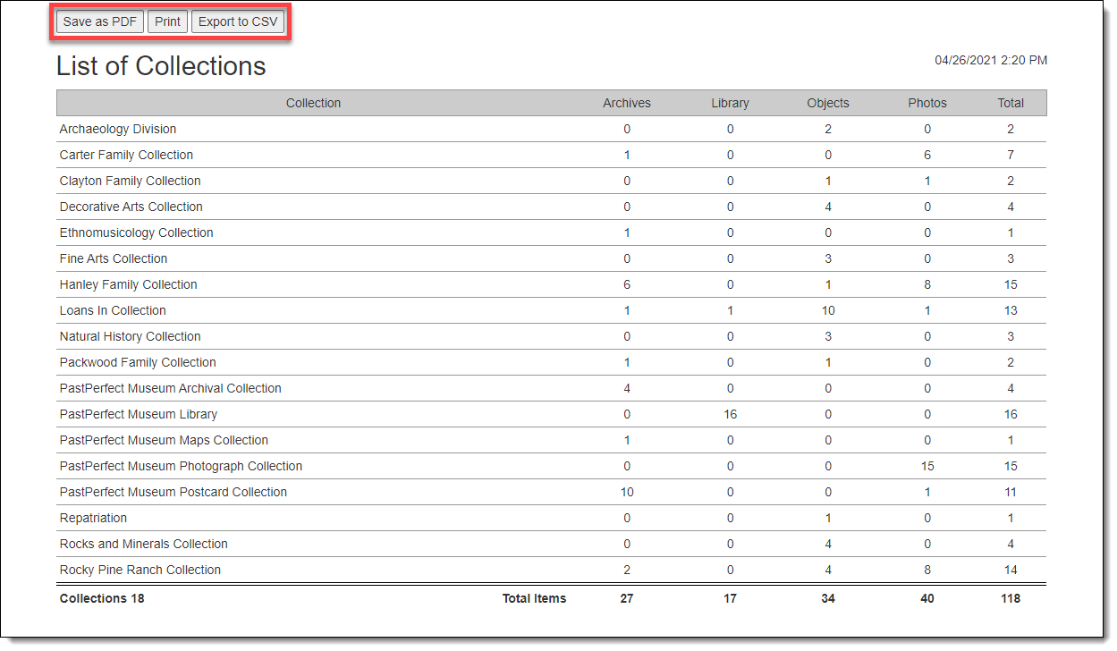 On the report preview screen, you have the option to save the report as a PDF, print it, or export it to CSV.