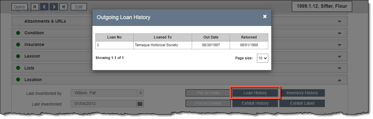 When the term of the loan has ended and all items have been returned, you will want to record that on the Outgoing Loan record. After you return the loan, it is considered a Returned Loan on the Outgoing Loans Query screen.